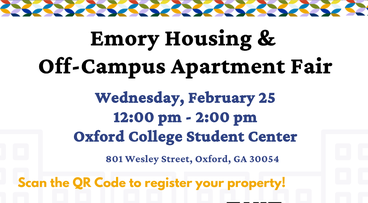 This event will allow Oxford College students who plan to move to Emory in Atlanta this spring or summer the opportunity to find out more about housing opportunities in the Atlanta/Decatur area.